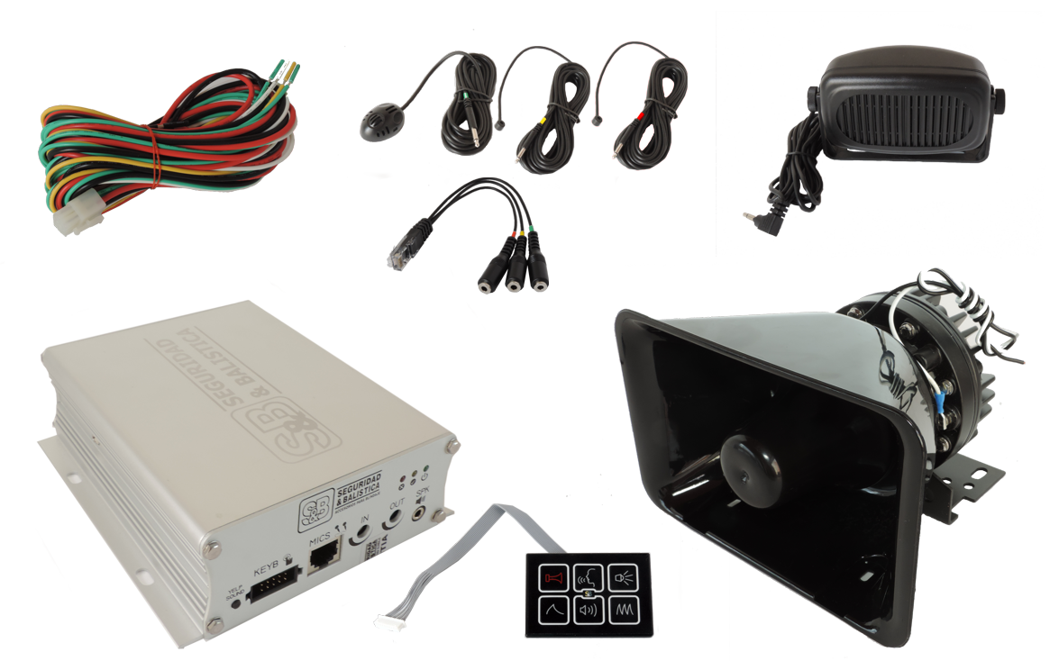 Equipo de perifoneo de 100W de potencia, 10 sirenas y comunicación de la voz en 2 vías tipo half-duplex. Diseñado para para el uso en vehículos blindados de trabajo continuo.